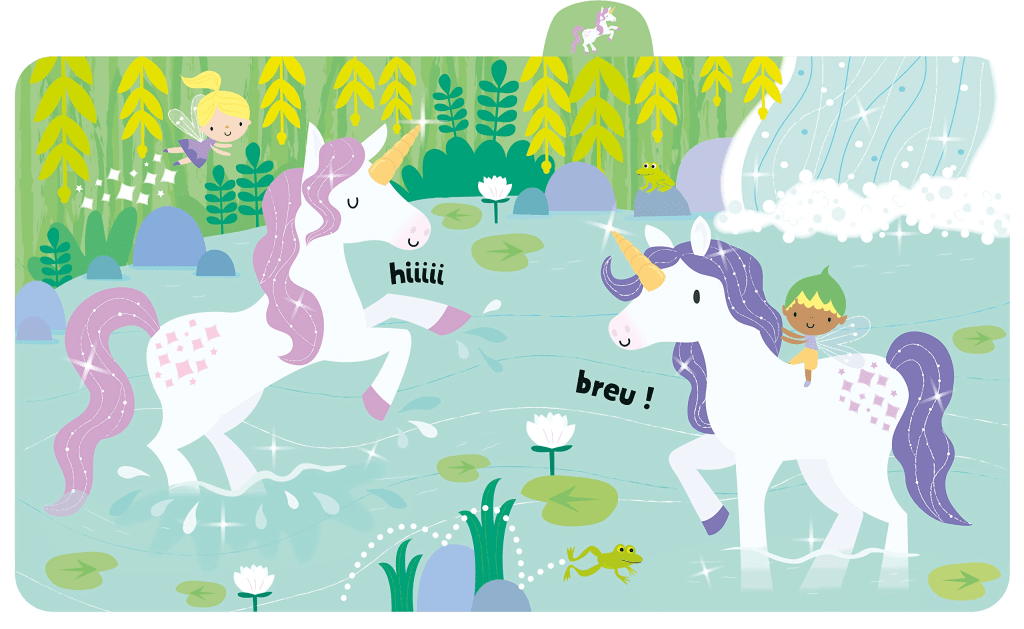 Chronique : Un livre coloré, aux dessins sympas; il n’y a que 5 sons différents, ce qui peut sembler limité, mais il est assez facile d’improviser une histoire où chaque licornes intervient à plusieurs reprises, parfait pour reconnaître et apprendre les langages des couleurs. Très apprécié par les petits enfants et les parents. Les très jeunes enfants apprécieront les illustrations aux couleurs vives.