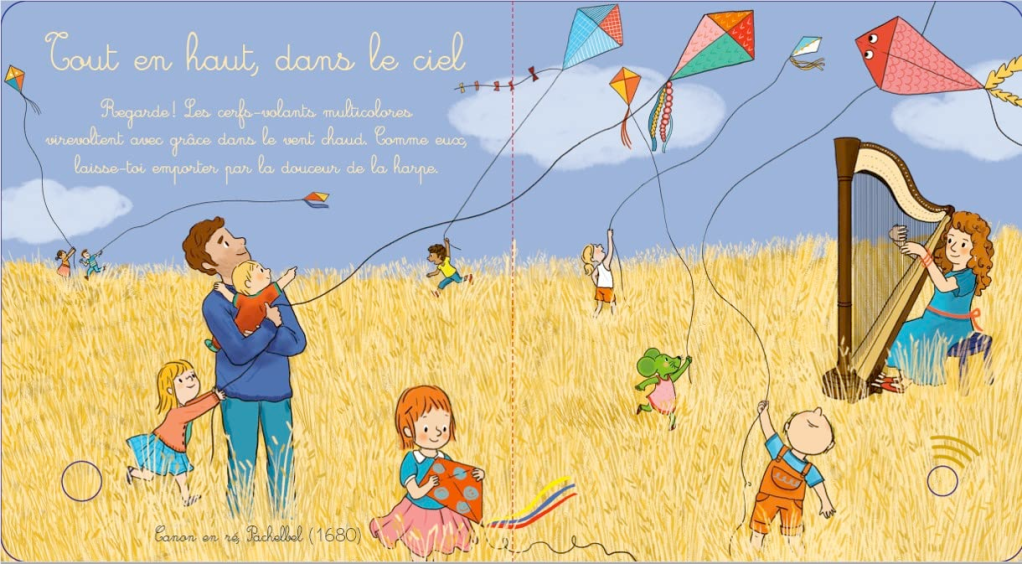 Ce livre nous propose un doux voyage musical, accompagné du son de la harpe. Les bébés se calment, s’endorment, airs dans « Canon en D » de Pachelbel, « L’Ondine » de Cécile Chaminade, « Murmure de la cascade » de Zabel, « Siciliana » de Respighi, « Valse en la majeur « Repos au milieu » de Brahms ou sur l’air de la chanson britannique traditionnelle Greensleeves.